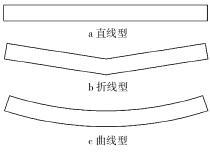 影響垂直螺旋輸送機性能的操作變量有螺旋轉 速、進口速度、填充系數(shù)、螺旋葉片的形狀、顆粒的形狀等。試驗選取進口速度為 10 m/s,由文獻[5]可知,填充系數(shù)對平均顆粒速度、平均顆粒軸向速度、平均顆粒周向速度的影響很小,而本文中主要分析近軸處的 平均顆粒周向速度、近壁處的平均顆粒軸向速度,因 此可選填充系數(shù)取做一個固定參數(shù),即填充系數(shù)為 50%,忽略顆粒形狀對輸送性能的影響,因此試驗選 取了螺旋轉速、螺旋葉片作為操作參數(shù),來展開詳細 的試驗設計。 根據(jù)文獻[5]的分析,選取螺旋轉速參數(shù)分別為600、900、1 000、1 200、1 400、1 600、1 800 r/min;螺旋 葉片母線的形狀分別為直線型、折線型、曲線型,其形 狀簡圖如圖 2 所示,由排列組合知識可知,需要進行21 次試驗。