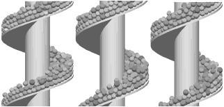 螺旋垂直提升機是螺旋輸送機中常見的一種。傳統(tǒng)的設計方法主要依靠經(jīng)驗公式設計,導致很難對螺旋輸送機的性能有很大程度地提升,而其在制藥、港口、農(nóng)業(yè)、水泥、食品等行業(yè)應用廣泛,因此有必要對螺旋輸送機的設計與制造方法進行研究。隨著計算機仿真技術的發(fā)展,越來越多的試驗應用于虛擬樣機的模擬中,這種處理不僅可以減少成本,提高效率,而且 能夠使設計者從產(chǎn)品的作用機理入手,解決在實際的 試驗中很難觀察物料輸送中細觀甚至微觀特征[1-2]。螺 旋輸送機性能的模擬研究,早是由 Shimizu 等[3]發(fā)表 離散元法對螺旋輸送機中顆粒流的研究,并將研究結 果與先前的經(jīng)驗方程進行了對比分析。Cleary[4]研究了 顆粒形狀對喂料口進入的物料下降形式和輸送機的輸送特性的影響。Owen 等[5] 詳細研究了操作條件,如 填充率、傾角和螺旋轉速等對螺旋輸送機性能的影 響,但其未對螺旋葉片的形狀進行詳細討論。而這一課題在國內(nèi)尚未有詳細的研究。本文中將對螺旋葉片進行研究,并結合其他操作條件,預測螺旋輸送機的性能。