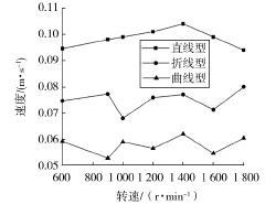 通過離散元模擬,得出了在不同轉速下的 3 種不同螺旋葉片形狀對平均顆粒速度的變化趨勢,如圖4所示,對于直線型母線螺旋葉片,顆粒的輸送速度從所示,對于直線型母線螺旋葉片,顆粒的輸送速度從保持線性減小,整體的輸送速度變化幅度為 0.01 m/s, 輸送平穩(wěn),且1400 r/min 輸送速度大。對于折線型 母線螺旋葉片,顆粒輸送速度在 1 000、1 600 r/min ,為 0.07 m/s,在 1 800 r/min 有增大趨勢,因此,從趨 勢中不能很好地得出螺旋轉速與平均顆粒速度之間的 關系。對于曲線型母線螺旋葉片,顆粒輸送變化范圍 小,輸送為平穩(wěn)。在 600~1 800 r/min 范圍內(nèi),平均顆 粒速度保持在 0.055 m/s 左右,輸送效果。